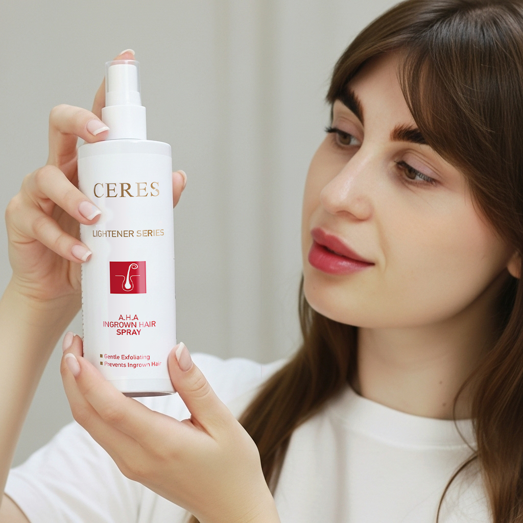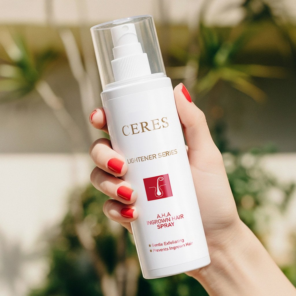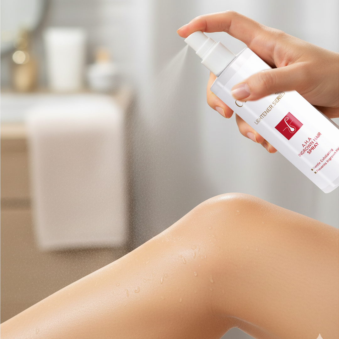 - Our A.H.A Ingrown Hair Spray is a topical solution designed to treat and prevent ingrown hairs. It contains Glycolic Acid, Tea Tree Oil, and Sodium PCA, which exfoliate the skin to release trapped hairs, reduce breakouts, and alleviate redness and irritation. Regular use helps prevent new ingrown hairs, resulting in clear, calm, and smooth skin, particularly effective for the legs, bikini zone, and other areas prone to bumps.