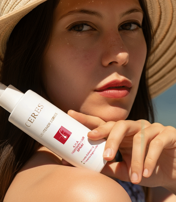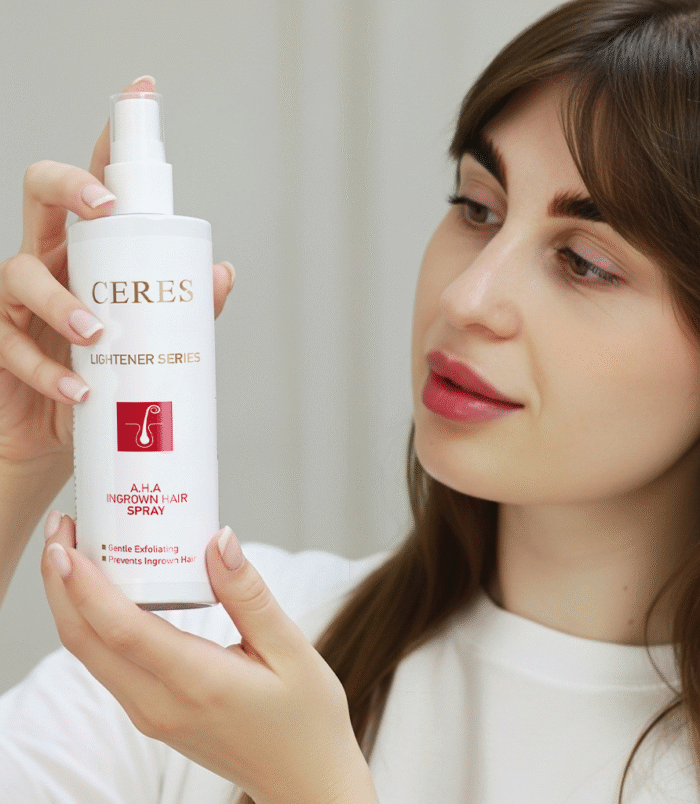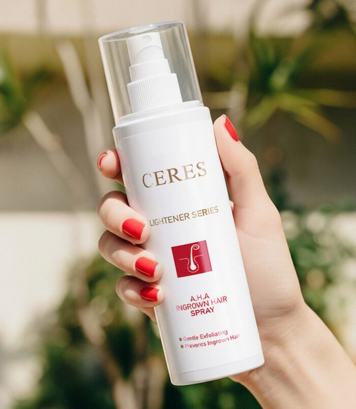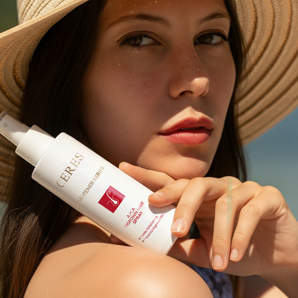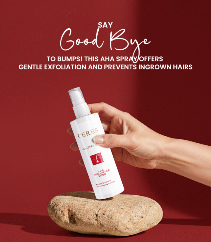 - Our A.H.A Ingrown Hair Spray is a topical solution designed to treat and prevent ingrown hairs. It contains Glycolic Acid, Tea Tree Oil, and Sodium PCA, which exfoliate the skin to release trapped hairs, reduce breakouts, and alleviate redness and irritation. Regular use helps prevent new ingrown hairs, resulting in clear, calm, and smooth skin, particularly effective for the legs, bikini zone, and other areas prone to bumps.